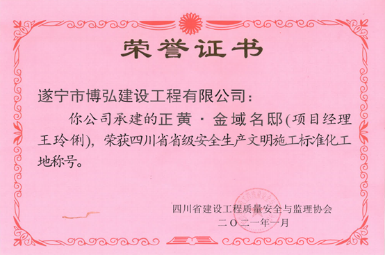 恭喜遂寧“正黃·金域名邸”項目再次獲獎,被評為“四川省省級安全生產(chǎn)文明施工標(biāo)準(zhǔn)化工地”獎稱號。